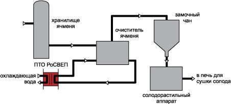 Разборные пластинчатые теплообменники РоСВЕП широко используются в производстве пива, начиная с самых ранних стадий процесса и заканчивая охлаждением конечного продукта с обеспечением качественного охлаждения на каждом этапе. На иллюстрации показан пример использования разборного пластинчатого теплообменника РоСВЕП для охлаждения очистителя ячменя для начала процесса пивоварения.