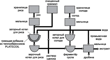 Дно и стенки заторного котла для риса пивного производства оснащаются рубашкой из теплообменников PLATECOIL. Менее чем за 11 минут, пар с давлением 3,5 бар, проходящий через теплообменники, разогревает содержимое котла до требуемой температуры при минимальном расходе пара.