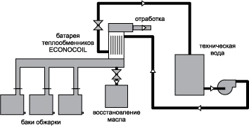 Кассета из теплообменников ECONOCOIL из нержавеющей стали, показанная на рисунке, предназначена для рекуперации тепла ванн для жарки чипсов для нагрева воды для технологических нужд предприятия. Воздух с горячим маслом после жарочных ванн проходит через кассету из теплообменников ECONOCOIL и передает тепло воде, прокачиваемой через теплообменники. Дополнительным преимуществом является экономия масла для жарки, так как оно конденсируется на поверхности теплообменников и затем стекает обратно в ванны.