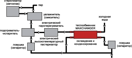На схеме показано использование теплообменника MAXCHANGER для стерилизации кипячением отработанного пара и конденсата после стерилизаторов. Подобная схема применяется для стерилизации молока и других жидких пищевых продуктов.