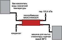 На иллюстрации показана схема нагрева паром воды до температуры около 90°C для промывки стеклотары перед заполнением продуктом с помощью высокоэффективных теплообменников MAXCHANGER