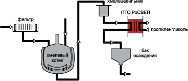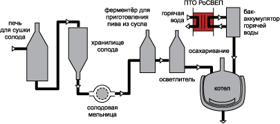 Сусло после ферментера поступает в фильтр-осветлитель, отсеивающий шелуху перед обессахариванием. Затем сусло поступает в варочный котел. Горячая вода, нагретая в разборном пластинчатом теплообменнике РоСВЕП, разбрызгивается на содержимое варочного котла, для создания требуемой температуры перед добавлением необходимого количества хмеля и доведением содержимого до полного кипения.