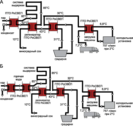 Как показано на иллюстрации паровой разборный пластинчатый теплообменник РоСВЕП применяется для нагрева вязкого виноградного концентрата перед отправкой в выдерживающие трубы.