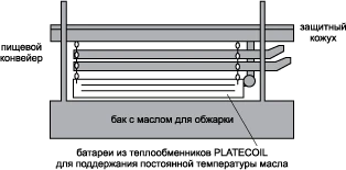 На иллюстрации показано использование элекрополированных теплообменников PLATECOIL в бесконтактных обжарочных ваннах. Преимущества использования PLATECOIL: равномерное обжаривание продукта, высокая безопасность и удобство для персонала, экономия масла.